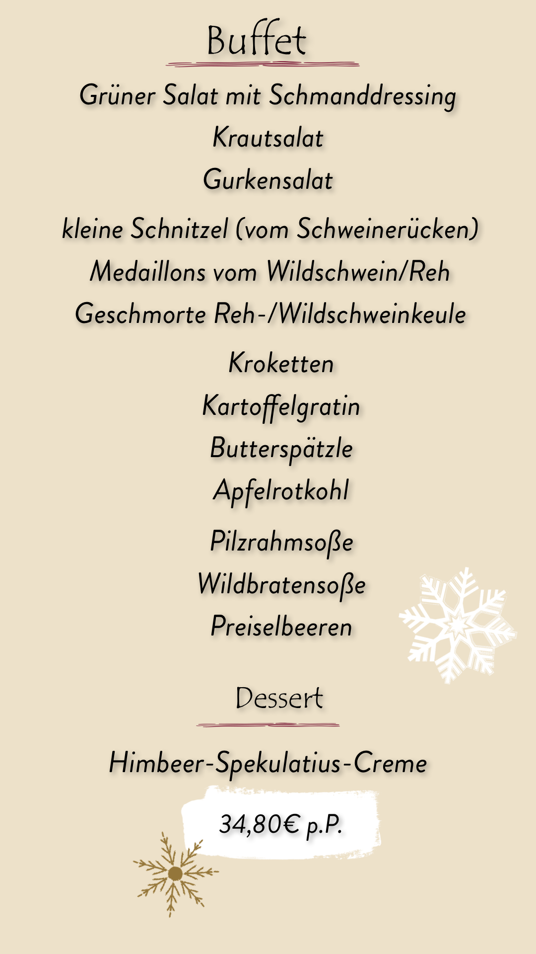 Wenn wir ein Catering haben, bleibt die Wildstubb leider aufgrund von Personalmangel geschlossen. Wir bieten KEIN „a la carte“ Essen mehr an, sondern ausschließlich Buffet, welches saisonal wechselt. Bei unserem aktuellen Frühjahrs-/Sommerbuffet ist für jeden etwas dabei und falls Ihr noch Fragen habt, dann sprecht uns einfach an.