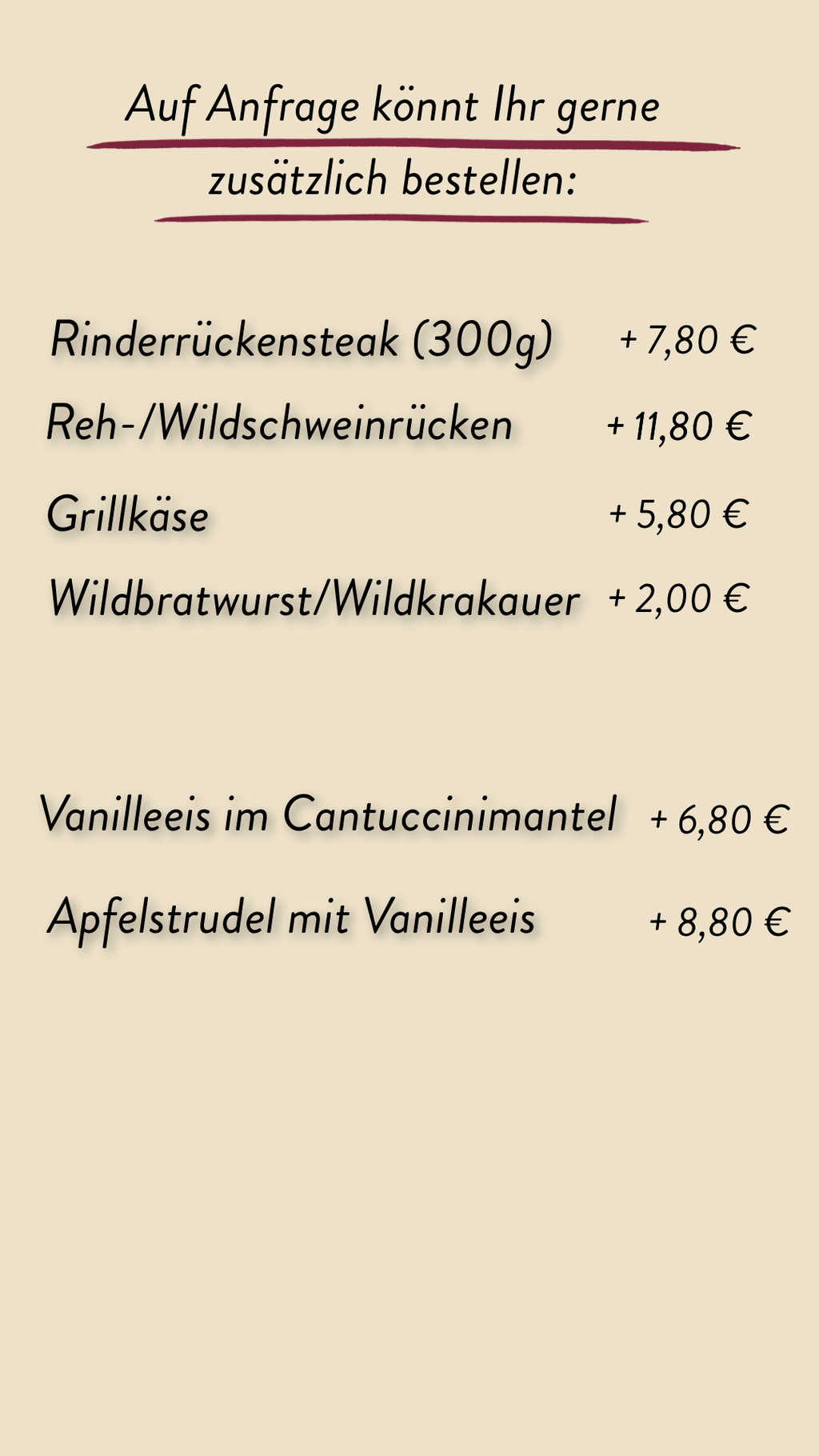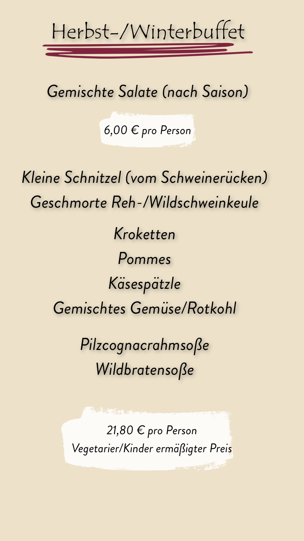 Wenn wir ein Catering haben, bleibt die Wildstubb aufgrund von Personalmangel leider geschlossen! Wir bieten kein „a la carte“ Essen mehr an, sondern ausschließlich Buffet, welches saisonal wechselt. Bei unserem aktuellen Frühjahrs-/Sommerbuffet ist für jeden etwas dabei und falls Ihr noch Fragen habt, dann sprecht uns einfach an. 😊