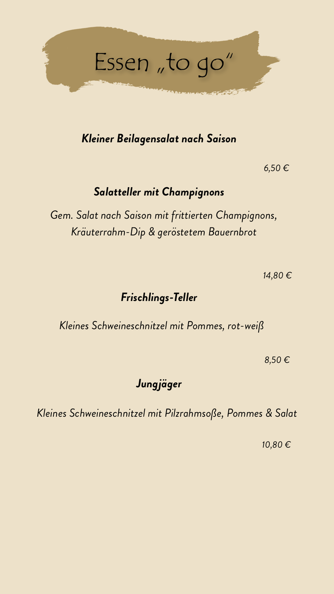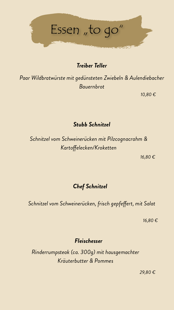 Hier sind unsere Speisen, die wir zum Mitnehmen anbieten. Bei besonderen Events wie Burger Buffet oder Barbecue Buffet gibt es diese Gerichte NICHT zum Mitnehmen!